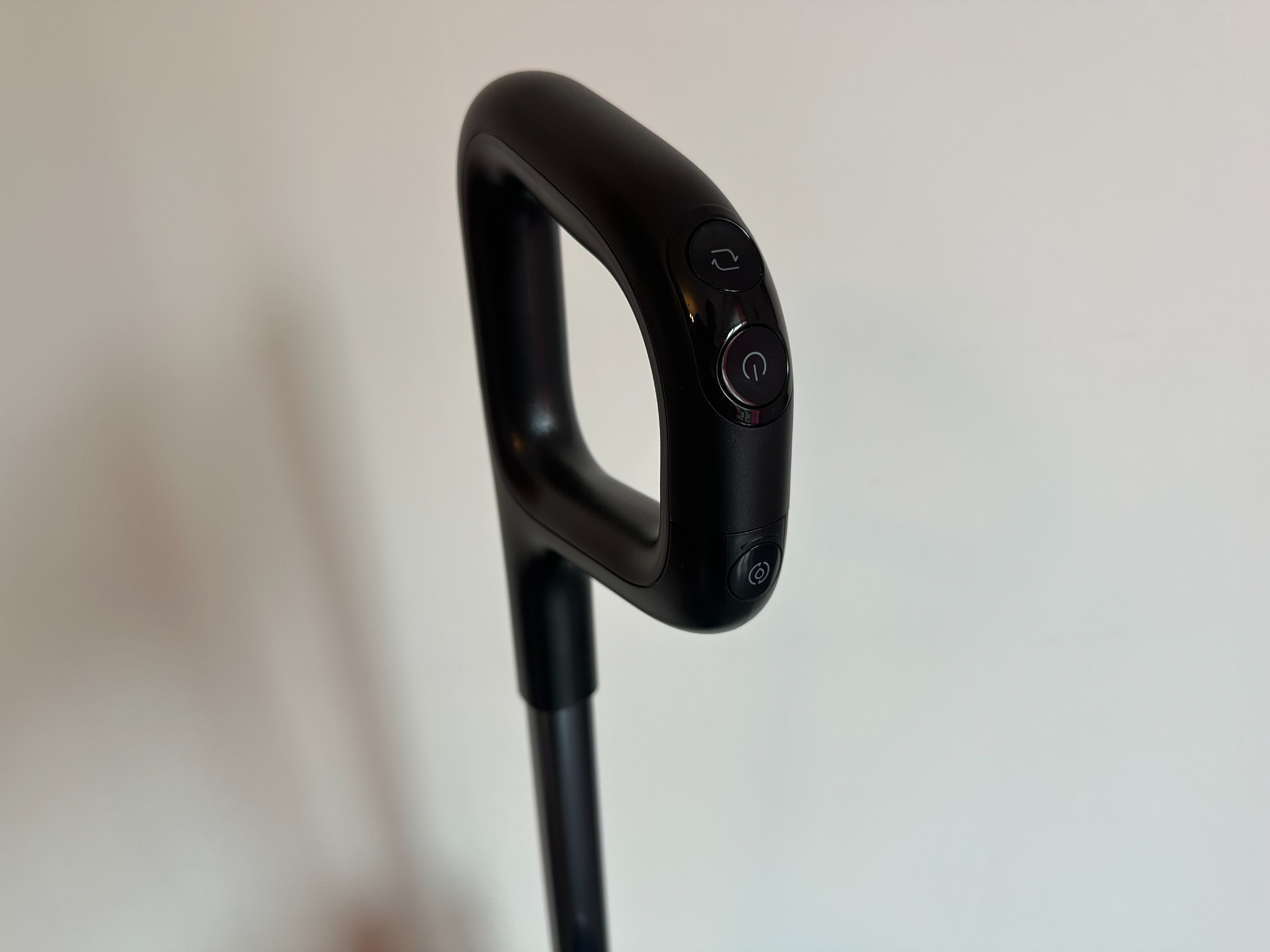 L’utilisation globale est simple et intuitive. En matière de commandes, on retrouve trois boutons sur la poignée pour contrôler le démarrage/arrêt (notez que l’appareil s’arrête automatiquement en position de parking), le choix du mode – ces deux boutons étant accessibles avec le pouce – et enfin, le bouton servant à lancer un cycle d’auto-nettoyage. Ce dernier est séparé des autres, à l’avant de la poignée, donc face à l’utilisateur quand le F25 est installé sur sa station.