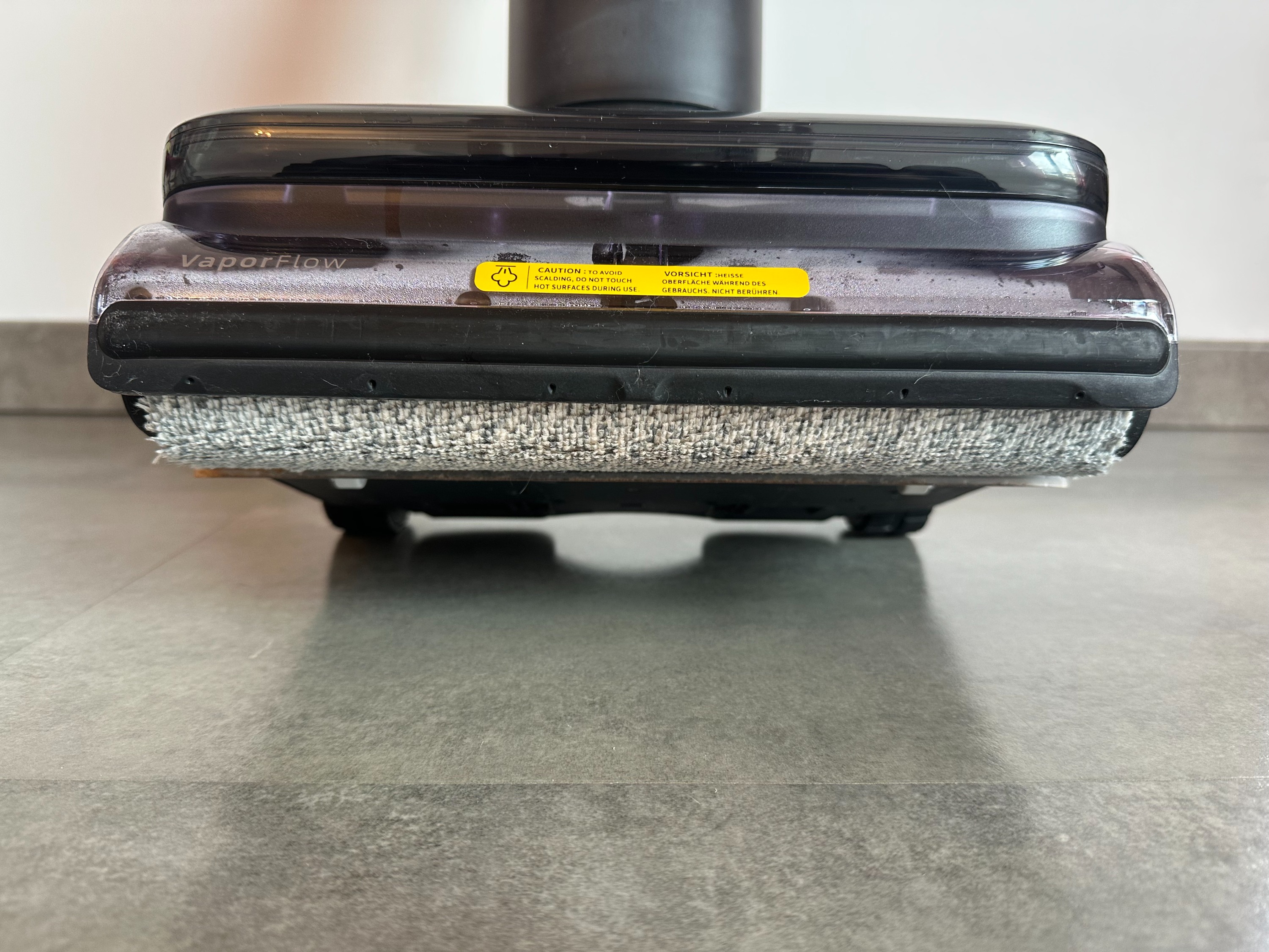 En mode vapeur, pendant le préchauffage, un décompte s’affiche sur l’écran (de 1 à 100) – au total, il dure un peu moins de 1 min 15 s, sachant que la vapeur est diffusée au bout d’environ 45 s. Le mode eau chaude, lui, ne nécessite pas de préchauffage. En mode vapeur, sur certains sols, à contre-jour, on voit les traces des 6 buses qui dispensent la vapeur sur le rouleau mais elles disparaissent au séchage.